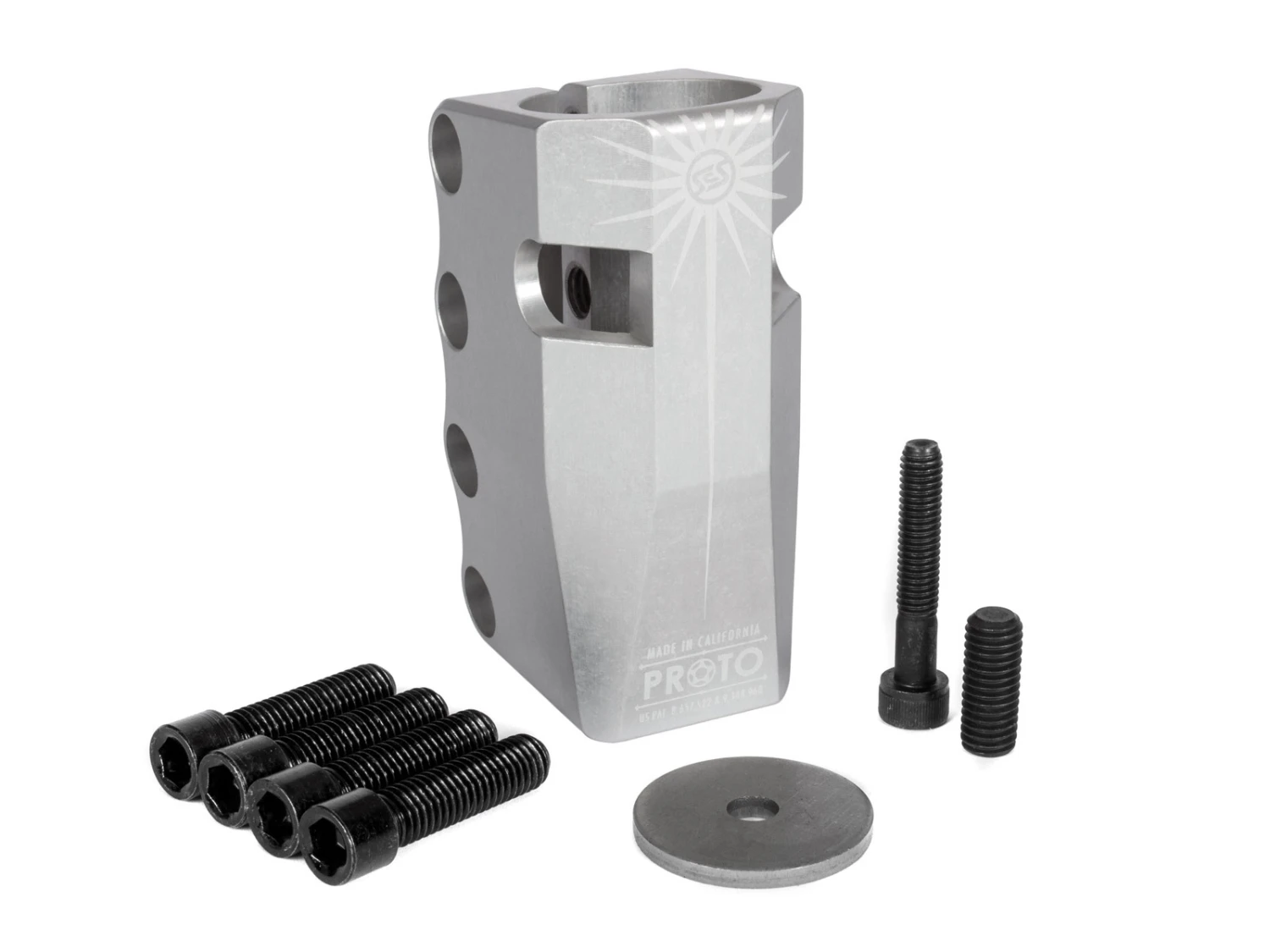 Eight years after inventing the world’s first and best Standard Compression System™ (SCS™), PROTO is proud to introduce the next generation of SCS™. The Sentinel SCS™ is the most technically advanced Standard Compression System™ ever created. Coming in at 3.5″ tall, it offers a full 2″ of handlebar support to accommodate the taller bars we are seeing become more prominent which is over 30% more support than a 3″ SCS™. It also features larger 8mm bolts with 6mm allen drives and an offset slot providing 25% more threads for the new larger hardware to tighten into allowing for increased torque and decreased chance of stripping giving it the ability to stay tighter, longer than any other SCS™ on the market. To top it off, despite being half an inch taller, increased weight was not an issue with its tapered top and base and two cutouts that removed unnecessary material and weight. There is also a brand-new feature called the Spreader-Bolt which can be used opposite of the 4 main clamp bolts to open the clamp for easy installation and removal, totally eliminating the need for the “penny trick”. The SCS™ logo is placed symbolically as the “third-eye” of the Sentinel in the center of a crown of thorns representing enlightenment and salvation from the ways of the past and guarding the future of scooter design.